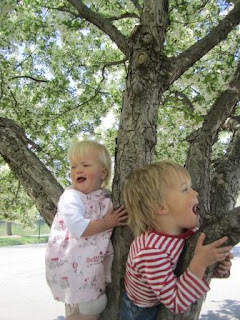 I have a really sweet picture of Emelia in the flowering trees from last year adn thought I'd try again this year. I had forgotten that Pete had wiggled his way in last year as well, but this year he told me that he wanted to "be a bird too" and to stick him up in the tree.